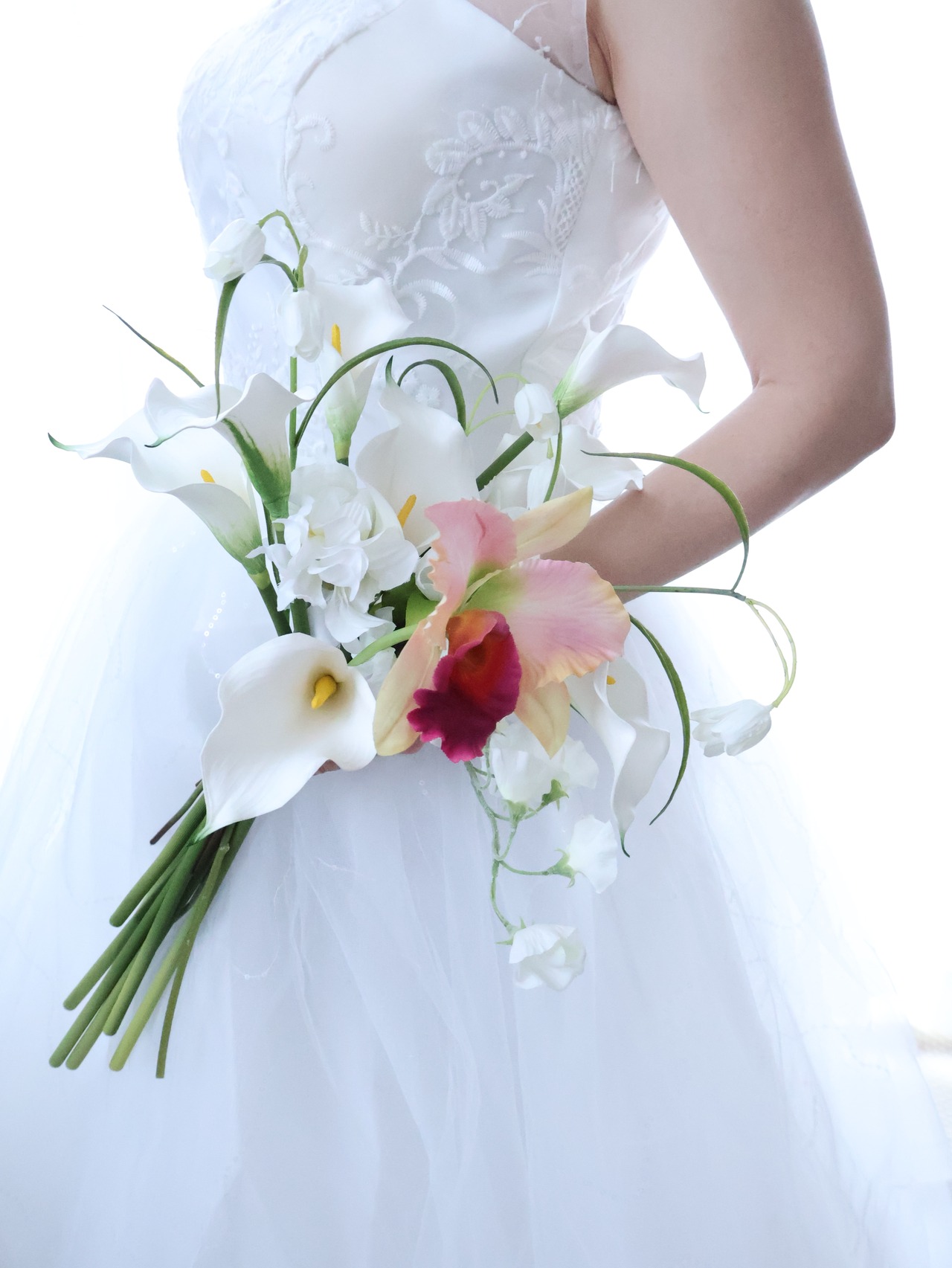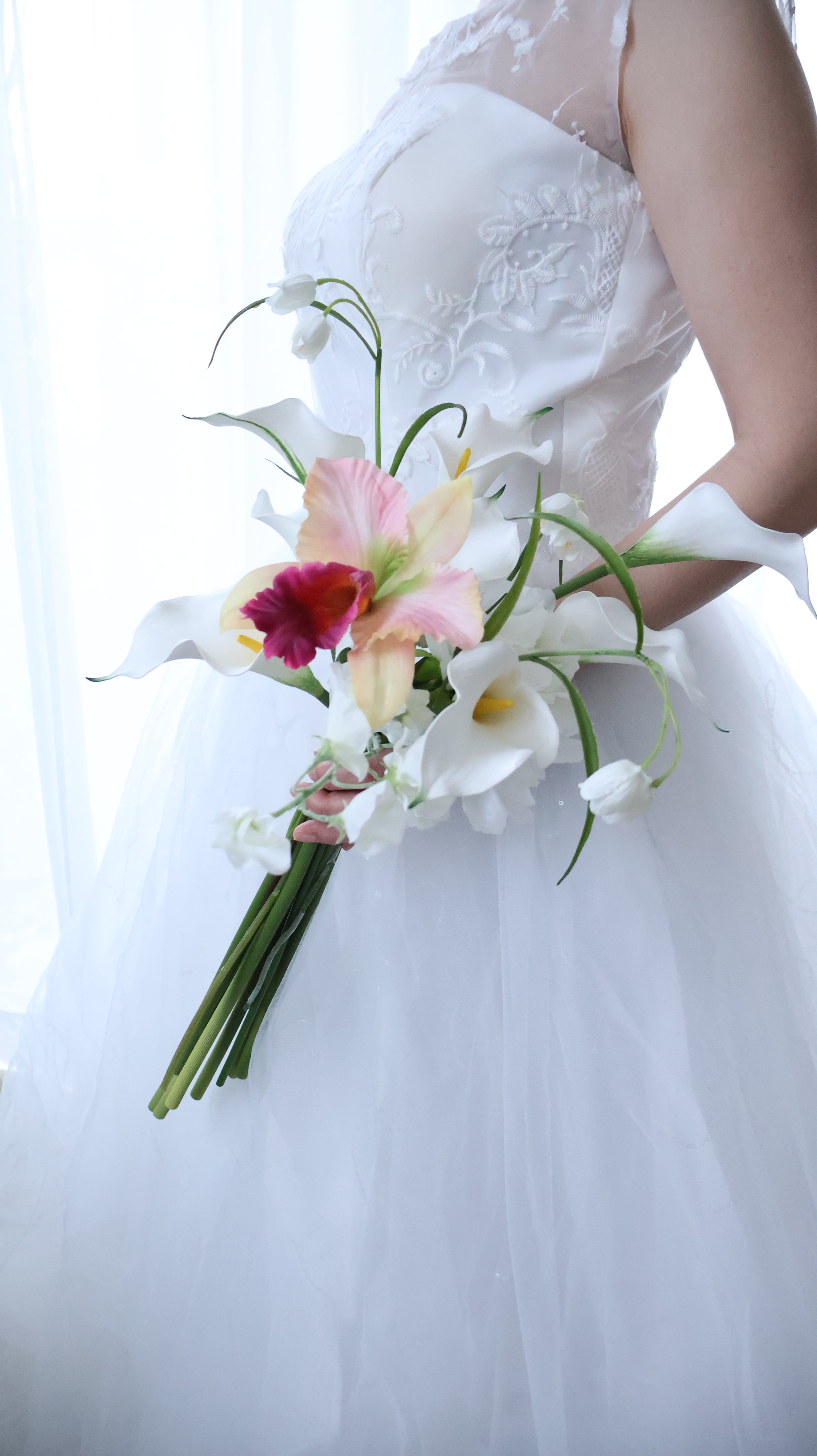 〇ホワイトを基調としながら、カトレアの優雅な色合いが上品なコントラストを生む