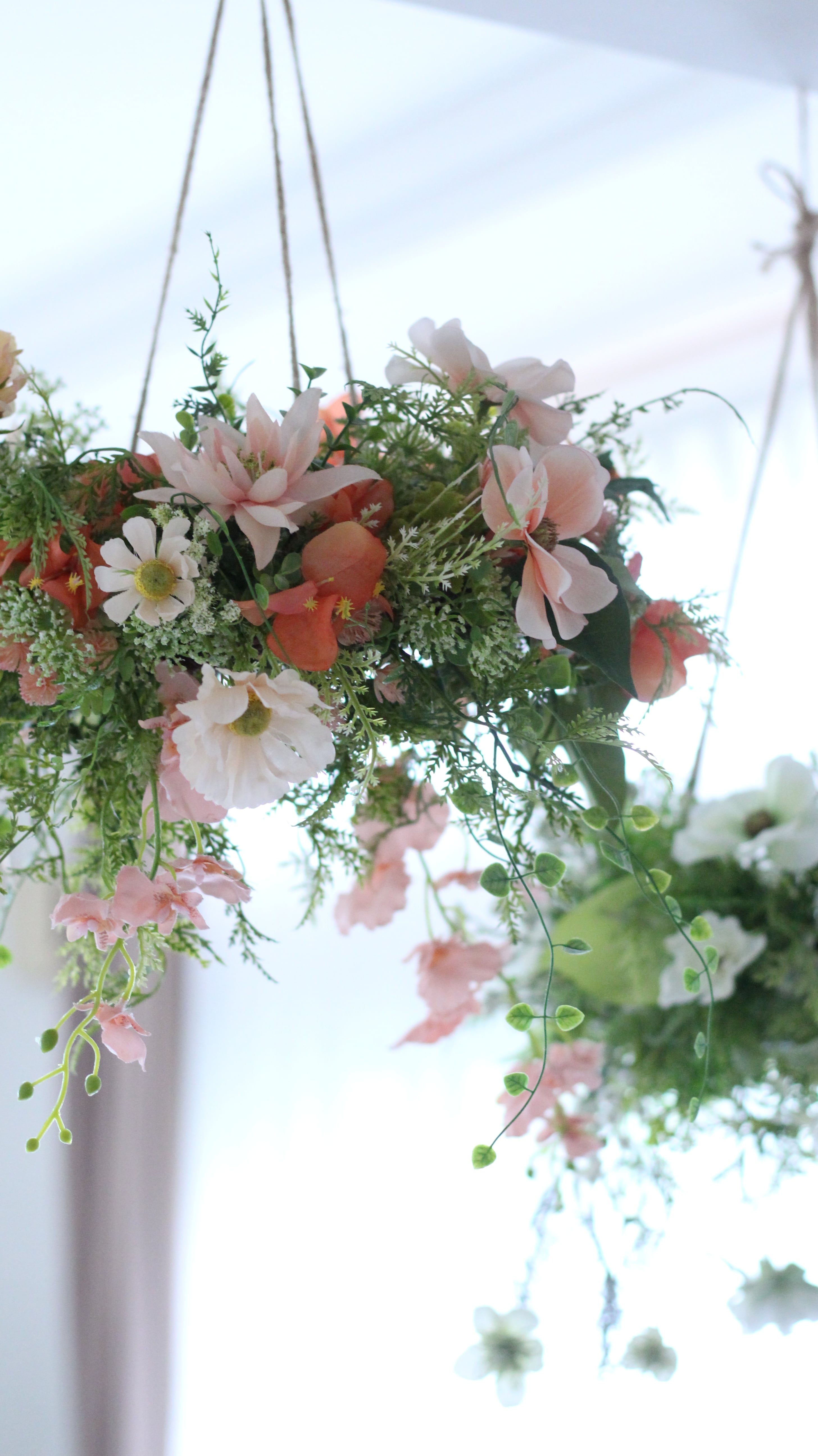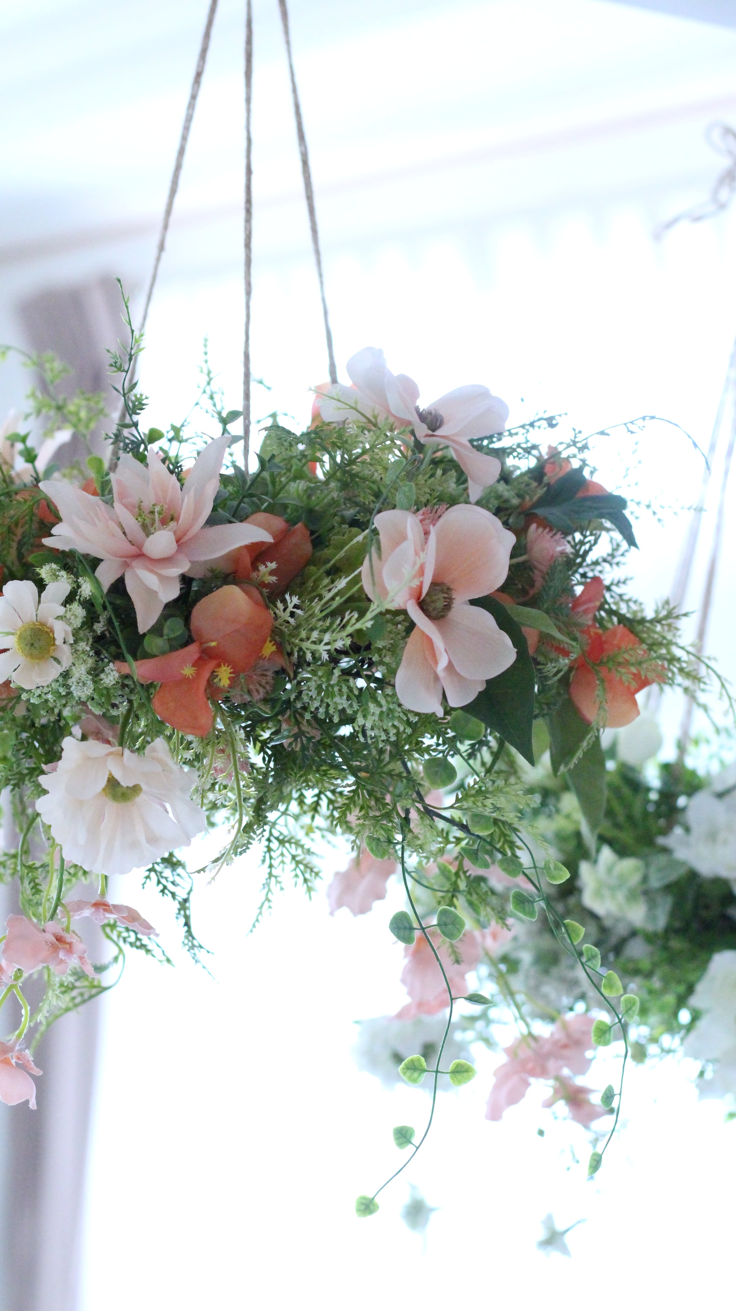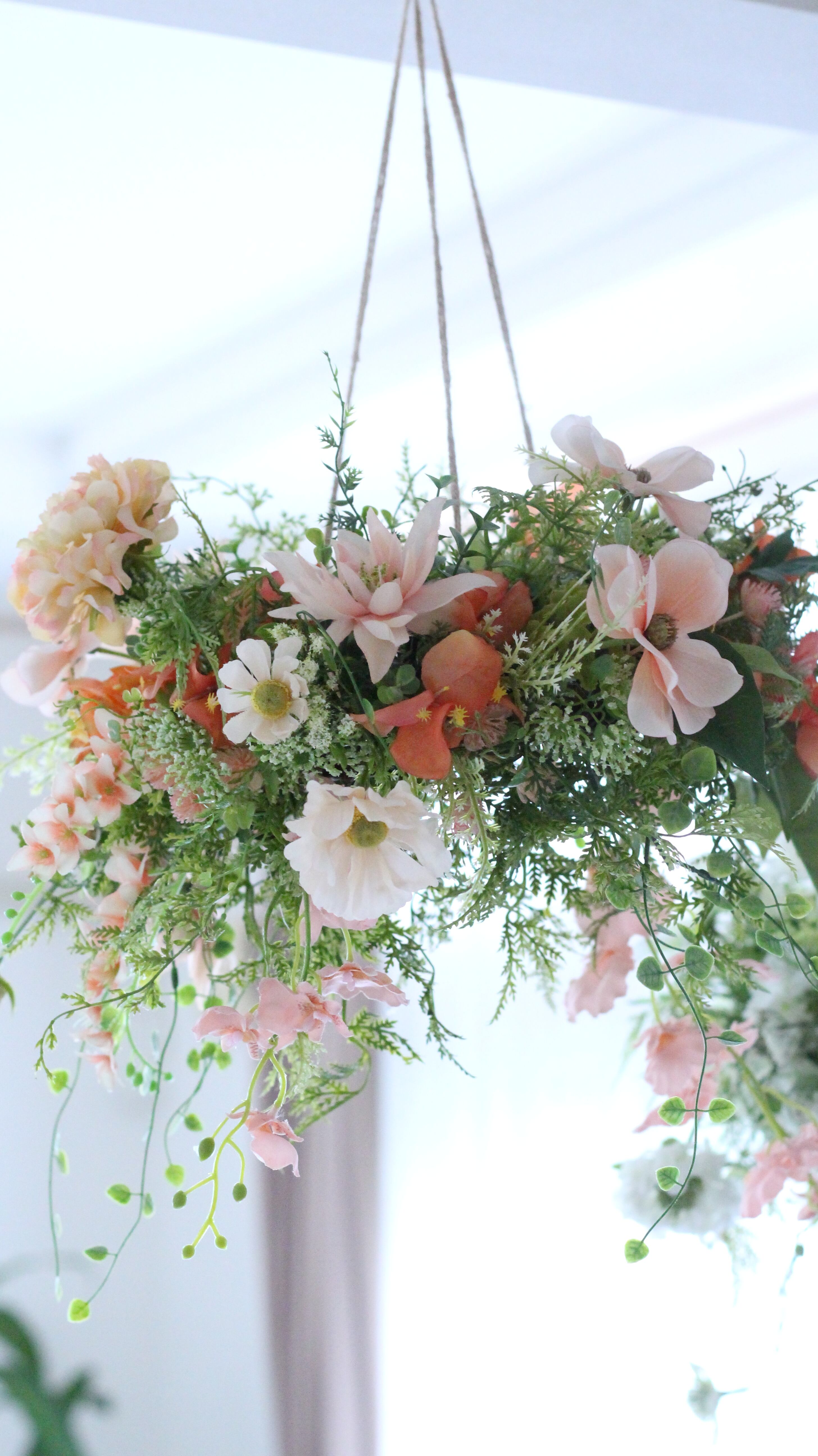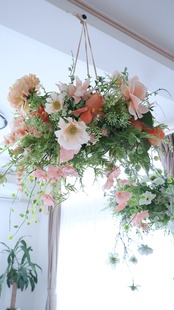 爽やかなグリーンを基調に花たちをナチュラルにアレンジし、まるで空中に浮かぶ花園のような、軽やかで洗練されたアレンジメントです。