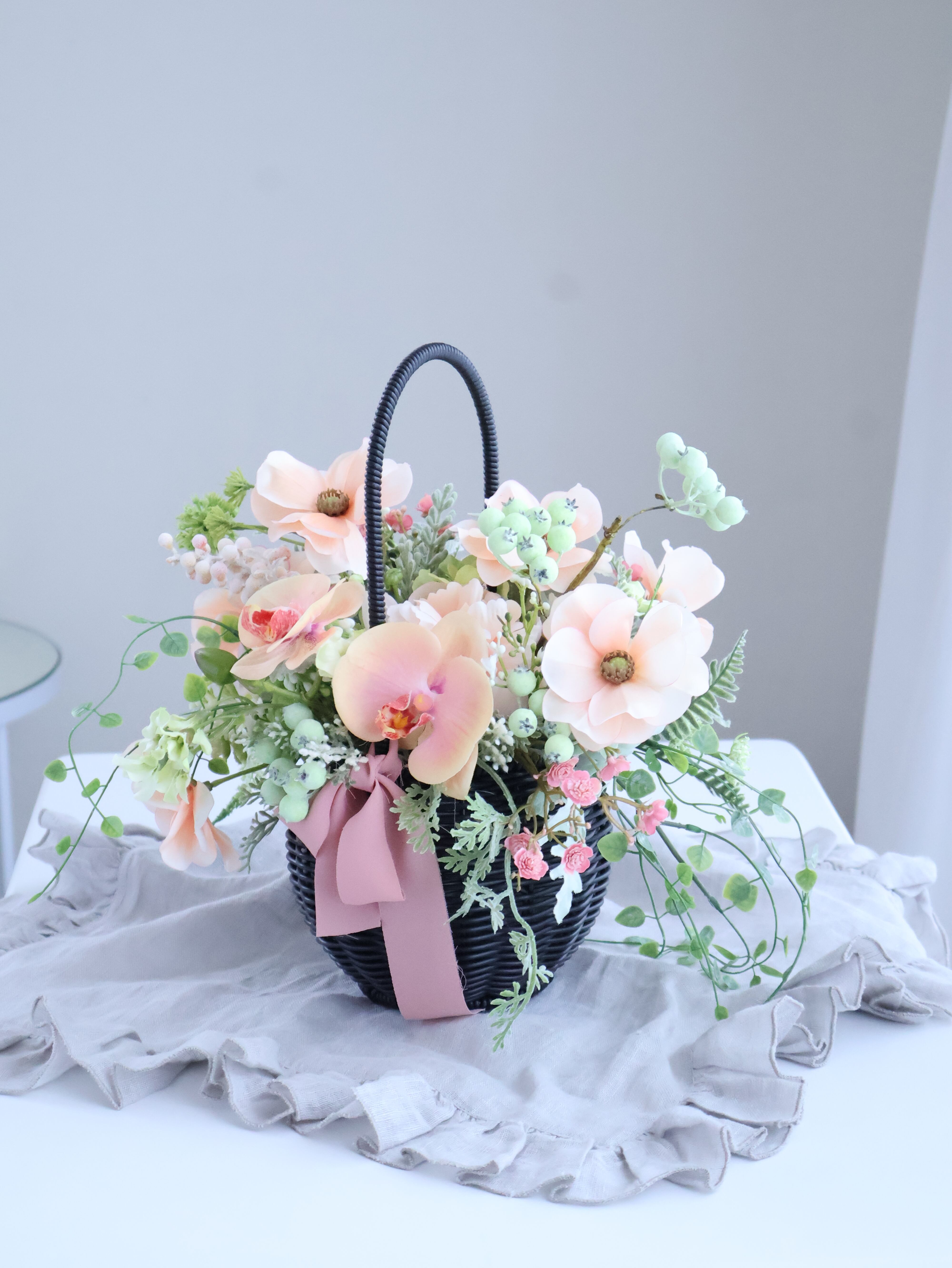 バスケットアレンジメント、胡蝶蘭、ピーチカラー
