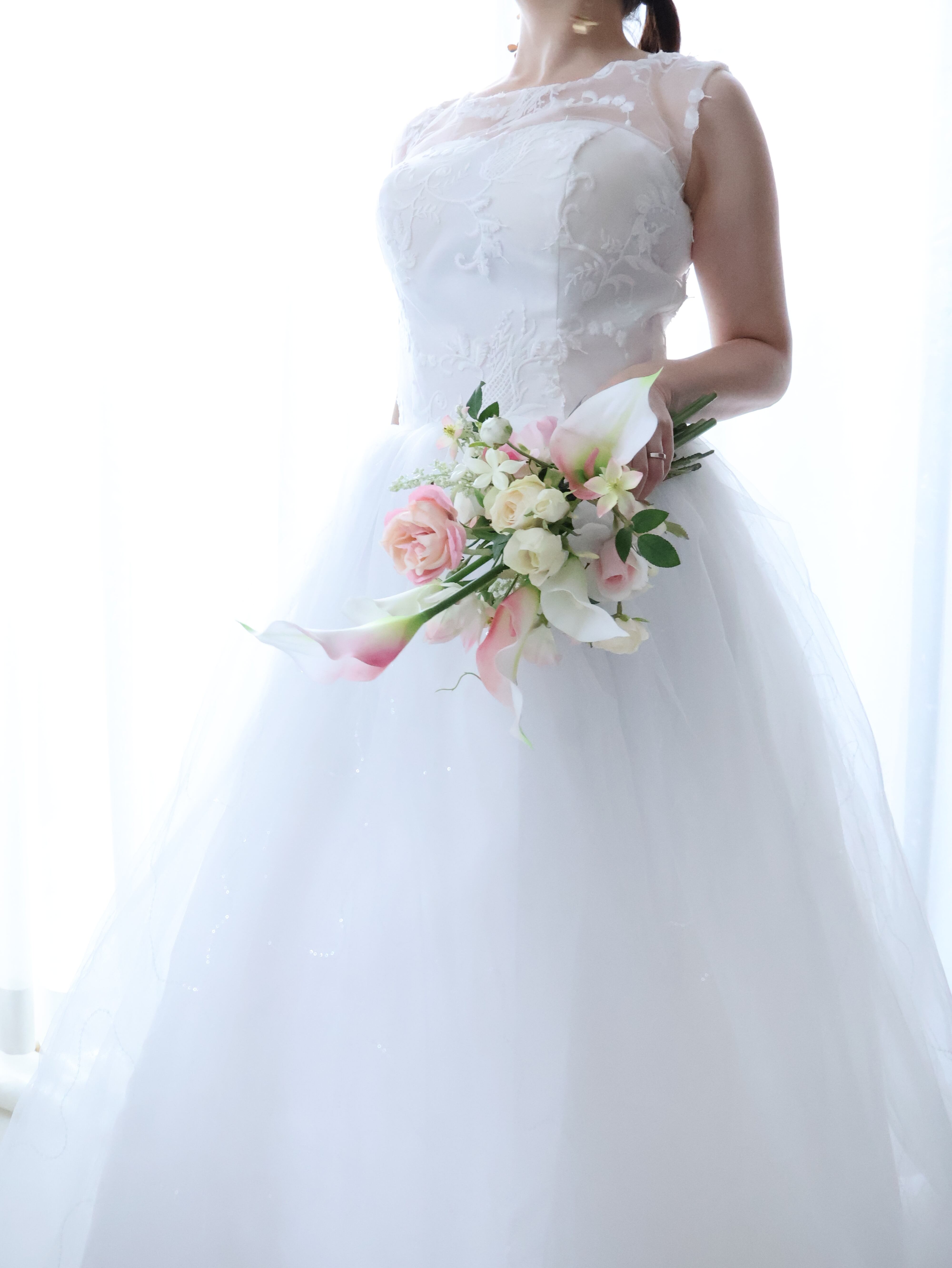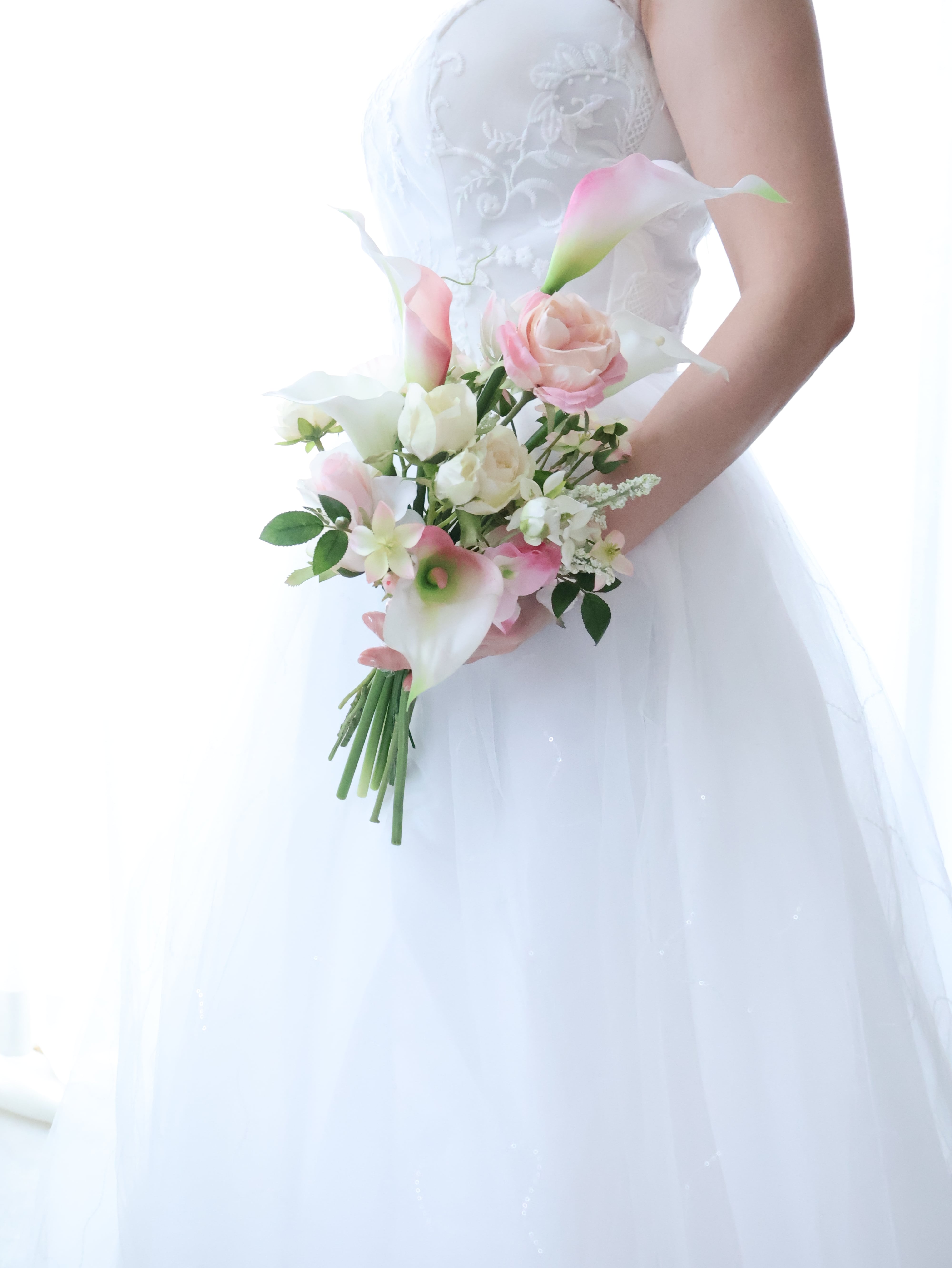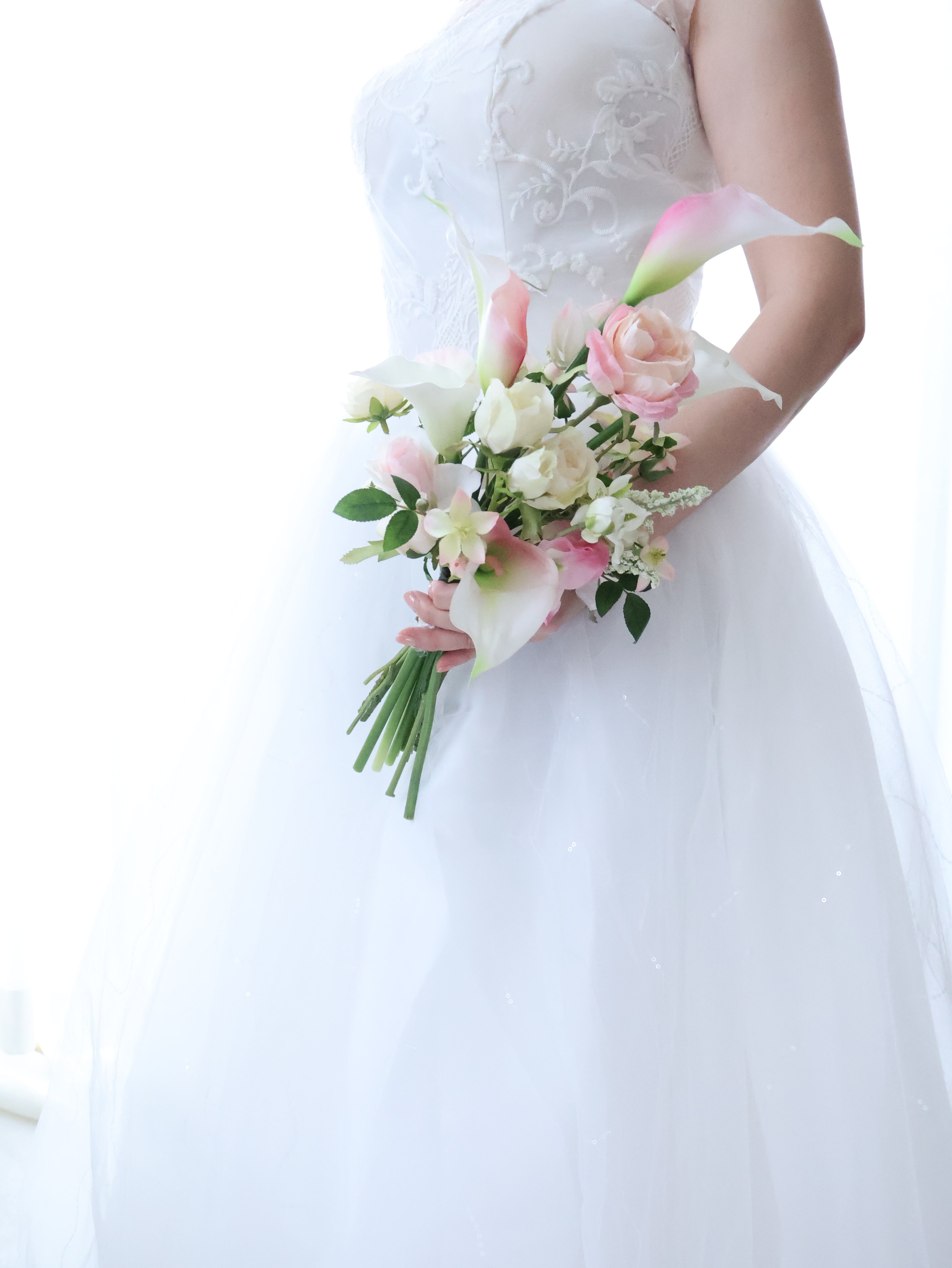 清らかさを象徴するホワイトと可憐なピンクで、特別な一日にふさわしい華やぎを