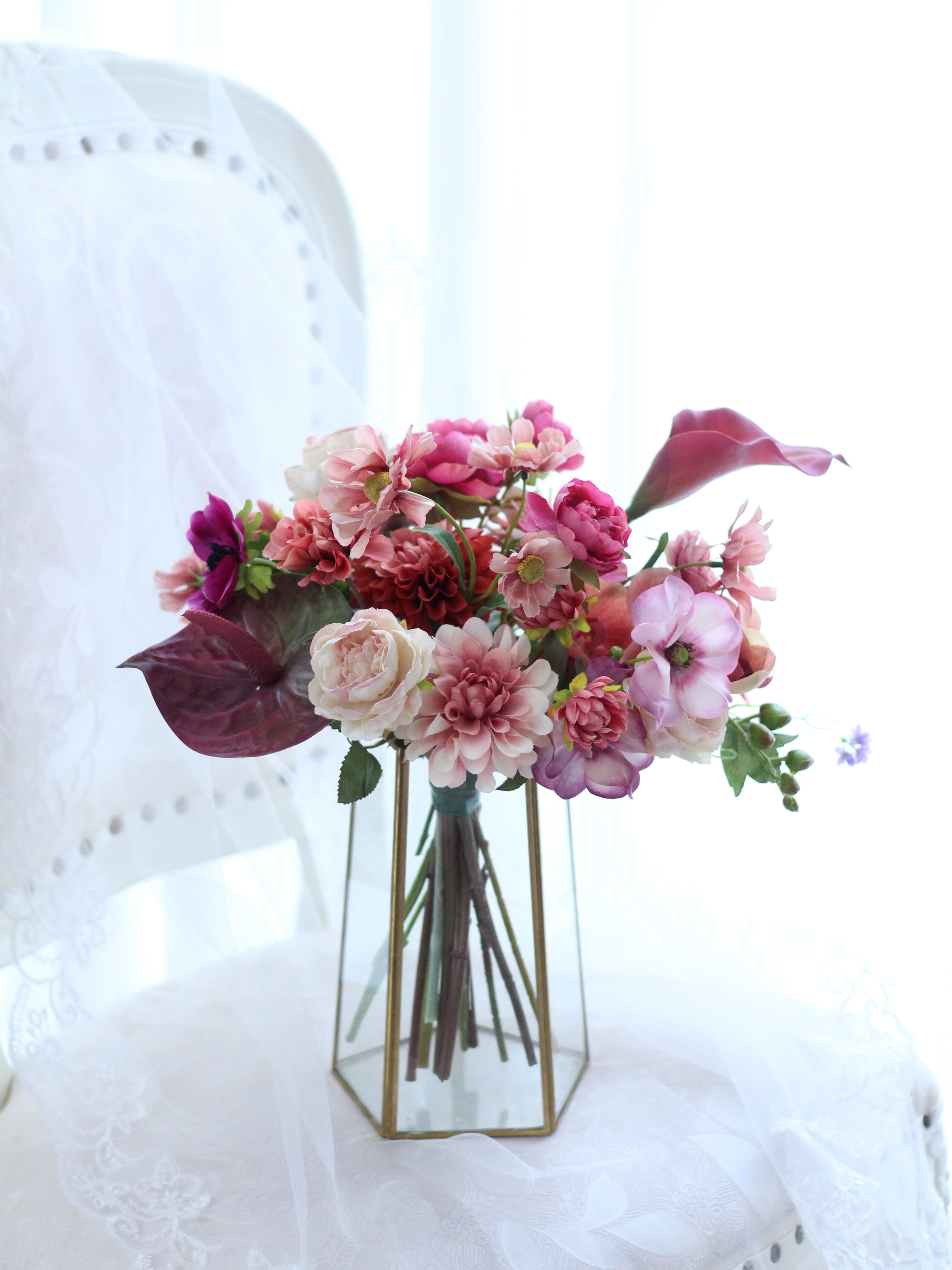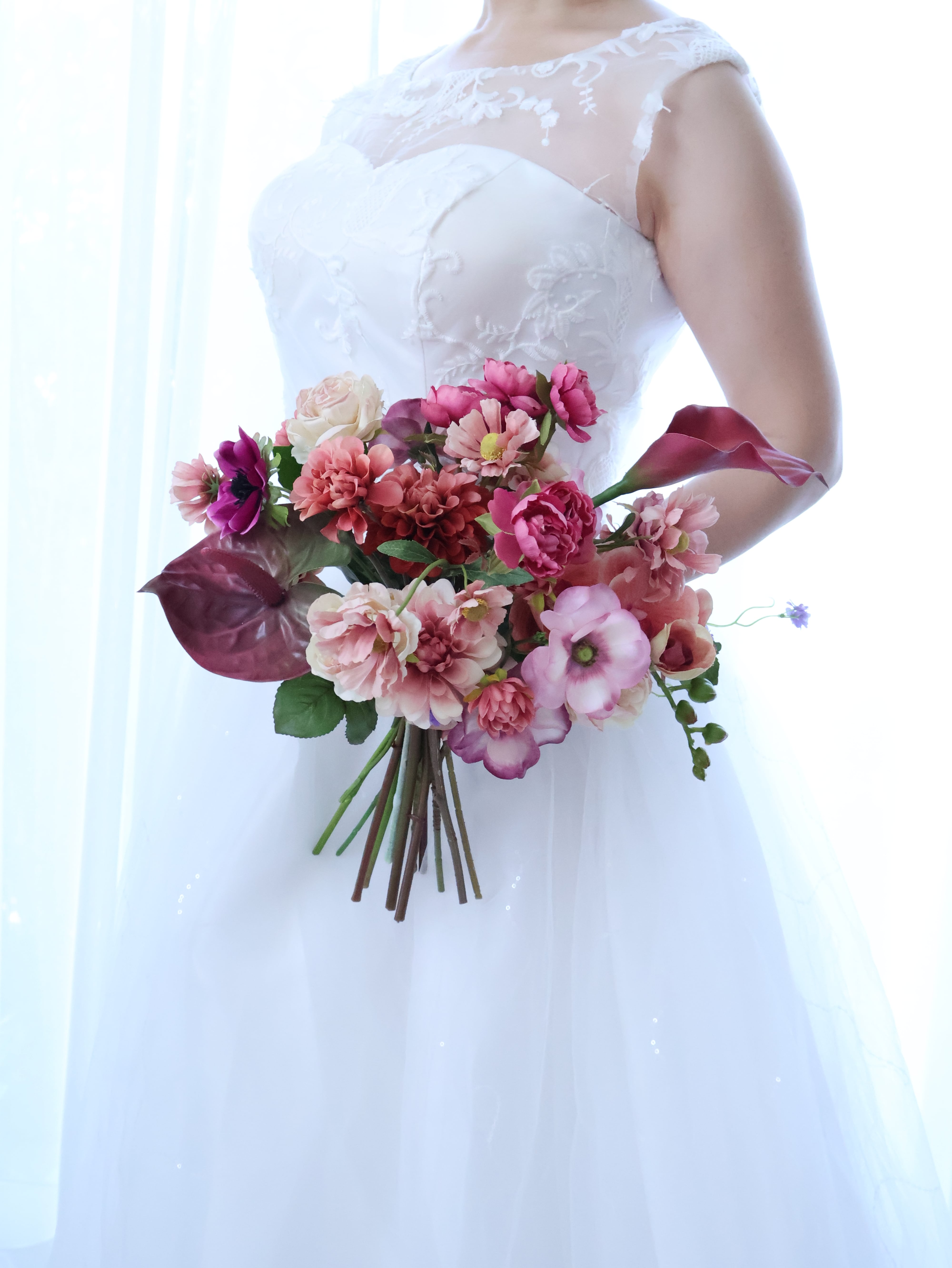 ピンク〜バーガンディの濃淡が絶妙で、視線を惹きつける印象的なカラーリングのブーケ